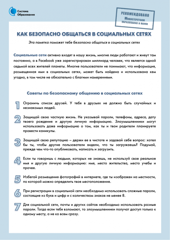 Основные советы по безопасности в социальных сетях:- Ограничь список друзей. У тебя в друзьях не должно быть случайных и незнакомых людей;
