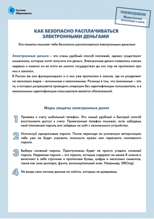 Основные советы по безопасной работе с электронными деньгами:
